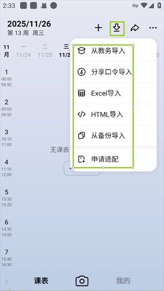 1、打开WakeUp课程表App,点击右上角【下载】图标,选择导入方式【支持从教务、分享口令、Excel 等多方式导入】。