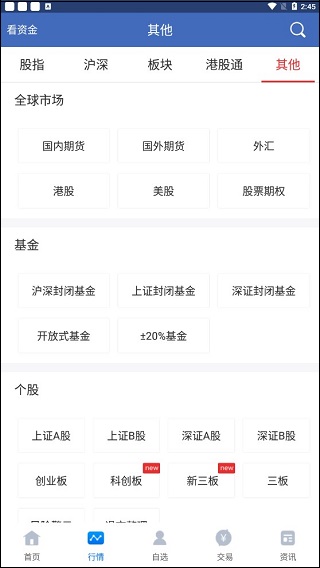 在“其他”功能区,覆盖全球市场的期货、外汇、港股、美股及股票期权行情;同时支持上证A股、上证B股、创业板、科创板、新三板、风险警示板、退市整理板等各类个股,以及债券等多元资产类别,满足全方位投资需求。