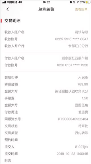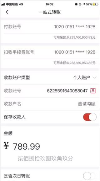 3、系统将自动跳转至一站式转账信息录入页面,并自动填充所选交易的转账内容,简化重复操作。
