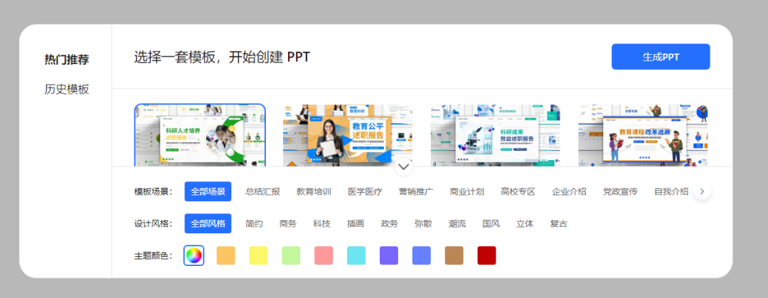生成大纲后,点击底部“一键生成PPT”,即可进入模板选择界面。