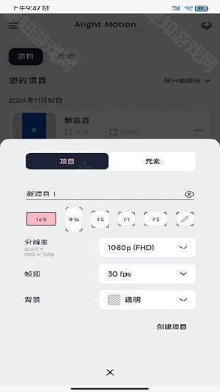 1. 下载并安装Axcven剪辑后,打开软件,点击首页中间的加号新建项目,根据需要设置项目名称、画面比例、分辨率、帧率及背景颜色。