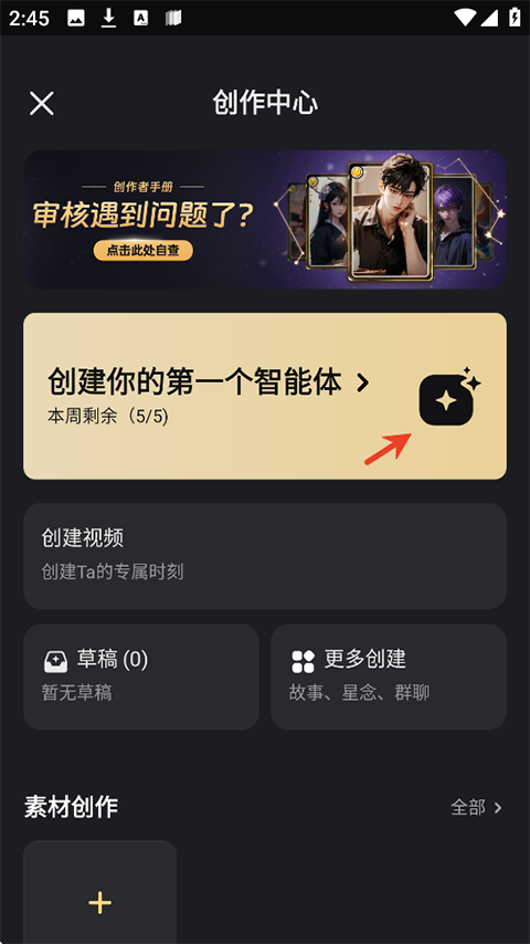 2、每周用户可免费创建五个智能体,点击“创建”即可开始个性化设置。