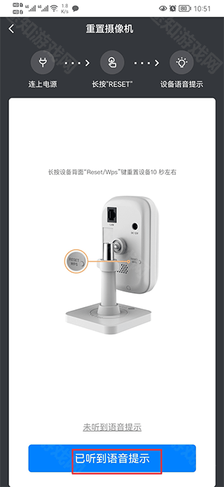 四、按照屏幕提示将摄像头恢复出厂设置,听到语音提示后,点击“已听到语音提示”继续下一步。