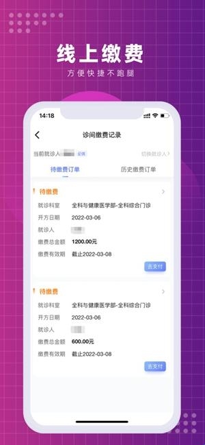 诊疗过程中产生的缴费项目,可通过App即时查看并完成支付,避免多次排队缴费的麻烦。