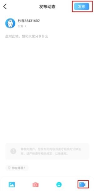 3、在发布动态页面中点击右下角的按钮上传视频,点击右上角的发布按钮,