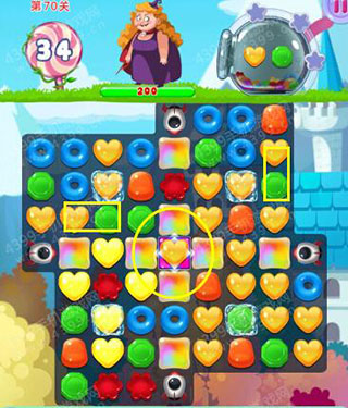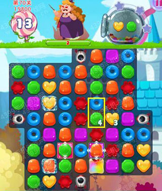 关卡目标:通过消除黄绿两色糖果击败胖女巫(生命值200)