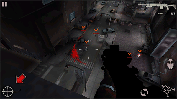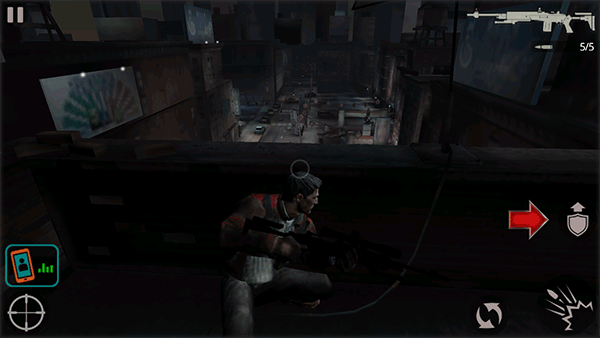 1、安装完成后进入游戏,初始场景位于天台掩体后。点击右侧盾牌箭头图标,角色将起身离开掩护状态。