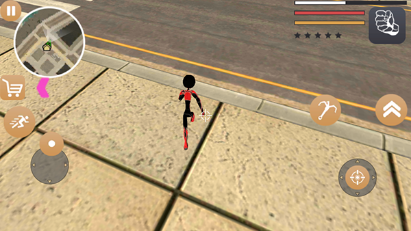 左侧区域负责角色移动与加速,右侧包含绳索发射、攻击与跳跃功能,右上角则提供武器切换及实时血量、经验显示。操作直观清晰,便于快速上手。你可以自由探索城市,与敌对帮派展开激烈交火。击杀敌人可获得经验值,累积一定数量后将触发星级通缉,引来警察及其他NPC的集中围剿。如何在重重包围中存活并高效清除目标,正是游戏的核心挑战所在。