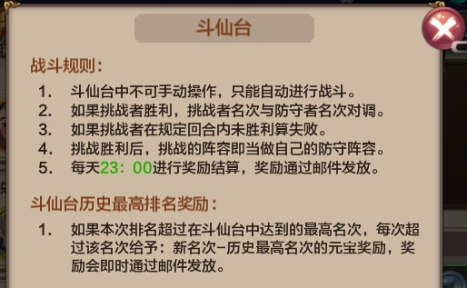 通关副本3-10后即可开启斗仙台,每次挑战消耗2点耐力。若挑战成功且超越历史最高名次,将获得额外元宝奖励;登顶第一名更可领取全部系统元宝奖励。此外,每日23点将根据实时排名发放对应奖励。