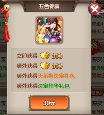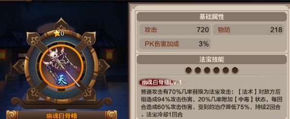 法宝分为【天】【地】【玄】【黄】四类,其中【天】系法宝拥有可替代普通攻击的特殊技能。初期获取高级法宝的主要途径包括宝物商店(18级开启)及活动期间花费30元购买【五色锦囊】,有机会获得【天】系橙色攻击法宝。