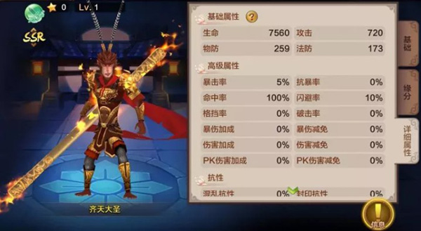 大圣初始拥有5%暴击几率与10%闪避,两项均为当前主流属性,攻守兼备。具体培养方向需结合后续成长属性综合判断。