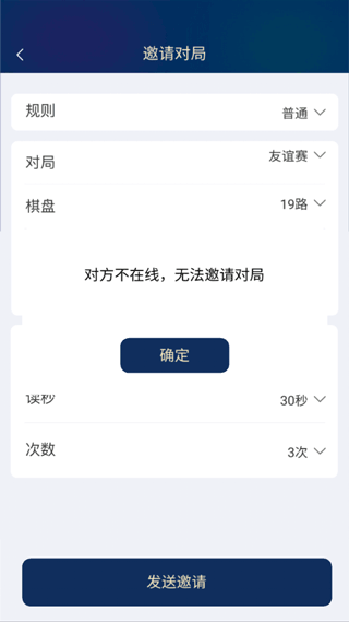 4、随后设置对弈规则,包括对局模式、棋盘路数、执子规则、棋份、局时、秒读及对局次数,确认后即可发送邀请。