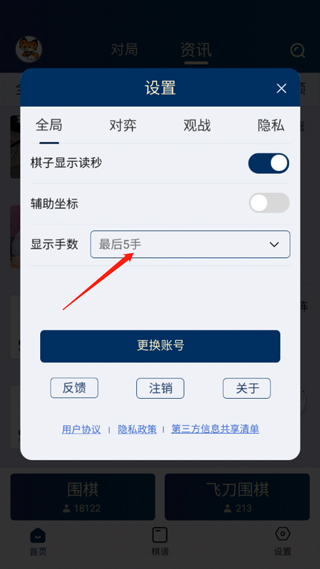 游戏内段位不可手动调整。若注册时为1段,则必须从1段开始对局,无法直接降级匹配低段位对手。如需重置段位,只能重新注册账号。不过,玩家可在右下角设置中调整“显示手数”,从而间接影响对局难度。