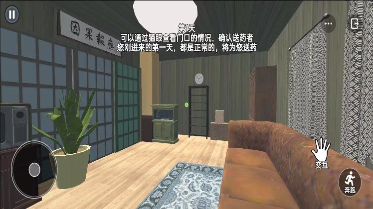 每日需通过猫眼观察门外送药者,并依据当前幻觉类型描述,谨慎决定是否开门或服用药物。