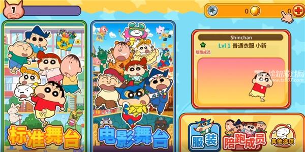 1、安装完成后点击开始进入主界面,主角自然是小新本人。你可以从多达117位陪跑角色中选择搭档,不仅包括野原一家、幼儿园同学,还有奥特曼、动感超人等跨界人气角色,阵容丰富,自由搭配。