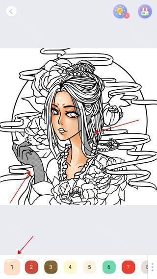 3、点击底部数字色块,对应区域会显示阴影提示,再次点击阴影部分即可完成上色。