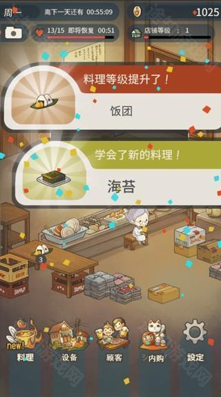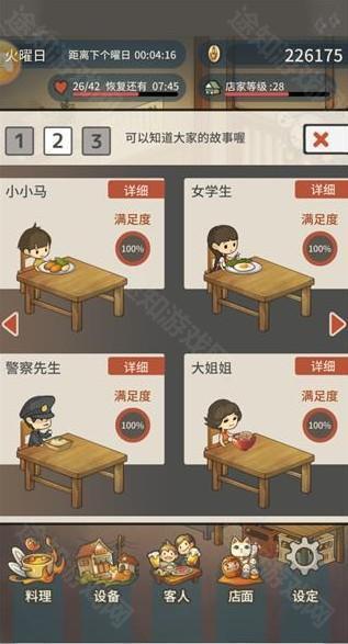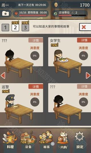 顾客吃了料理,他们的满意度会相应上升,满意度上升后还会引发对话。游戏中的金币主要用来购买店内设备,例如能够增加制作料理总上限的料理放置台,餐桌用来增加在店内吃饭顾客的人数上限,以及冷藏库、收银机等等提高各项属性的道具。在进入店内的每位食客都有着独特喜欢的料理,不断地吸引食客来吃饭从而增加每个食客的满足度。随着满足度的增加会触发不同食客的特殊对话剧情。