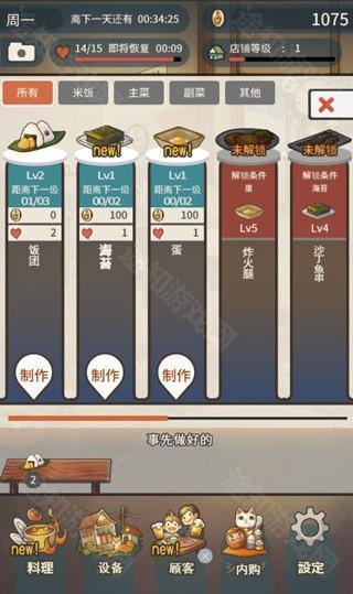 游戏初始,会有新顾客光临,游戏初始由于只有一张料理存放台,所以可以为客人们制作饭团、海苔、蛋三种中的两种。游戏的初始金币为1000,体力为15,店铺等级为1。