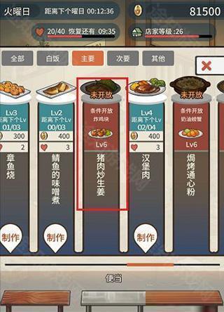 3、研发新料理,如果你多次制作一种料理,那种料理就会升级,从而可以研究出新的料理,例如,当【炸鸡块】到6级时才可以开放出【猪肉炒生姜】这个菜式,