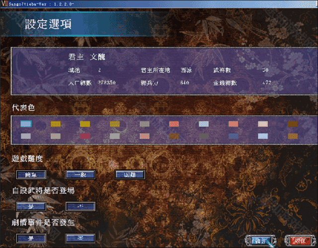 最后设定己方阵营颜色、游戏难度、是否启用自设武将等参数,点击“确定”即可正式开启你的三国冒险之旅。