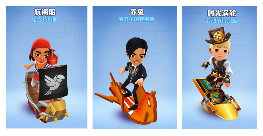 第一套:洛奇的机械手表(滑板期间提升10倍得分)、嫦娥小月兔(飞天状态加速)、卷卷金色耳环(手动触发双倍得分)