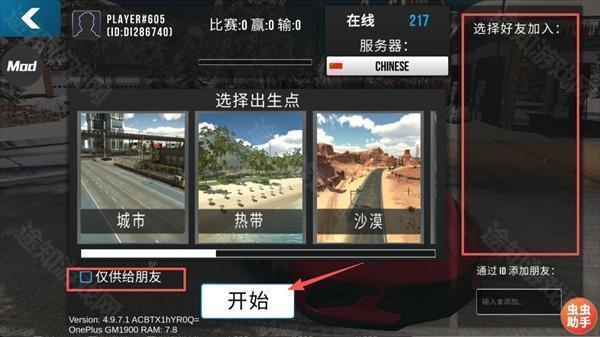 选择城市、热带或沙漠等出生地图,若勾选【仅供给朋友】可创建私密房间,设置完成后点击【开始】进入联机服务器。