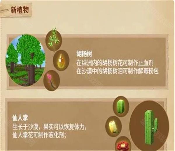5、仙人掌遍布沙漠,其茎与木棒可合成尖刺武器,果实食用后恢复25点体力,更是驯服骆驼的必备道具。