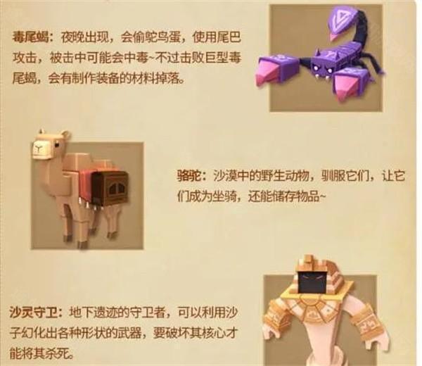 【骆驼】:不仅可作为坐骑代步,还能装载物品,提升沙漠生存效率。