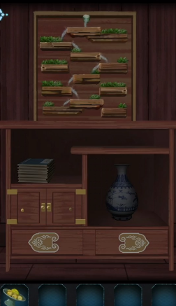 22、将花瓶置于窗台,依照提示摆放,成功打开第二个房间的门,并从柜中取得玉牌。