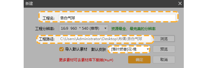 作品起名《告白气球》,记住作品的工程路径,选择皮肤UI,点击“确定”。