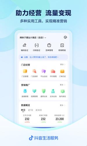 抖音来客平台官方版(又称抖音来客商家版)提供登录、经营、结算等全流程功能,依托抖音庞大用户流量,助力商家轻松开展线上经营,快速实现收益。